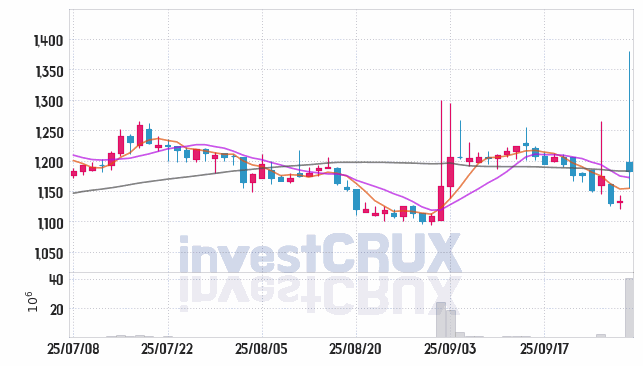 시가 : 1,198원, 고가 : 1,380원, 저가 : 1,155원