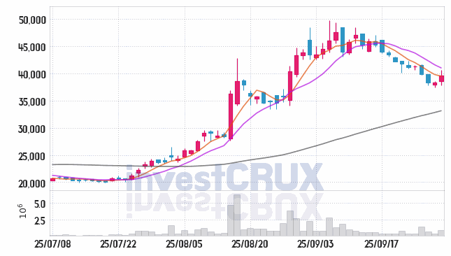 시가 : 38,500원, 고가 : 40,600원, 저가 : 37,850원
