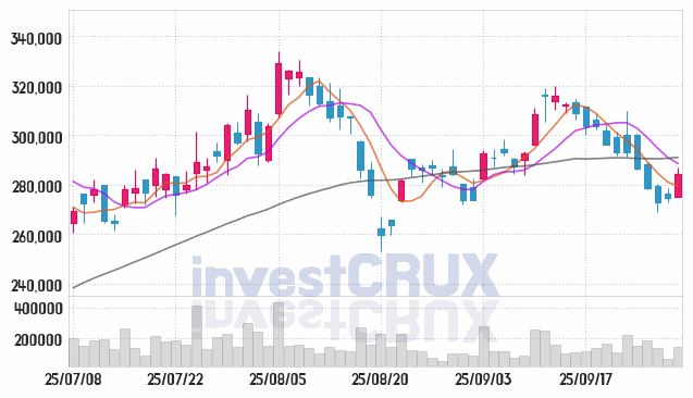 반대로, 5일간 주가 데이터 중 가장 높은 저가는 25년 09월 23일에 기록했던 291,500원인 반면 최저 저가는 25년 09월 26일에 거래되었던 269,000원입니다.
