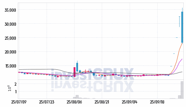 최고 거래량 기록은 25년 09월 30일에 나타난 443,775주이며, 최저 수치는 25년 09월 24일의 8,556주입니다.