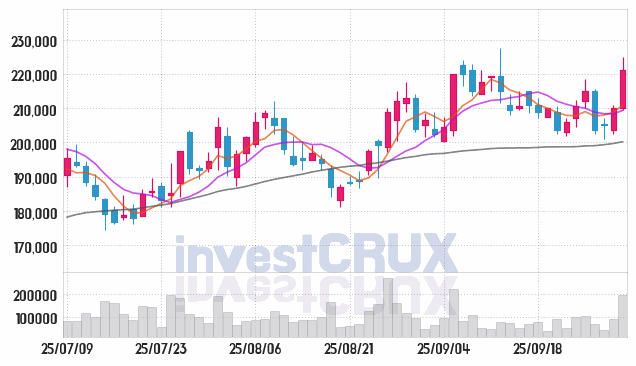 시가 : 210,000원, 고가 : 225,000원, 저가 : 209,500원