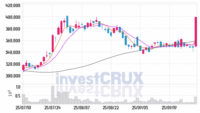 반대로, 5일간 주가 데이터 중 가장 높은 저가는 25년 09월 29일에 기록했던 349,000원인 반면 최저 저가는 25년 10월 01일에 거래되었던 341,000원입니다.