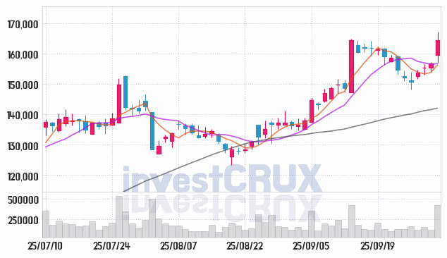 최고 거래량 기록은 25년 09월 26일에 나타난 162,813주이며, 최저 수치는 25년 10월 01일의 120,527주입니다.