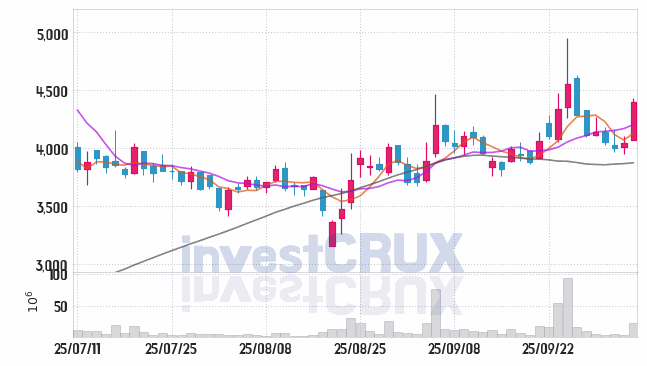 반대로, 5일간 주가 데이터 중 가장 높은 저가는 25년 09월 29일에 기록했던 4,105원인 반면 최저 저가는 25년 10월 02일에 거래되었던 3,950원입니다.