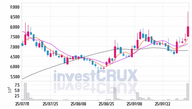 시가 : 7,490원, 고가 : 8,750원, 저가 : 7,480원