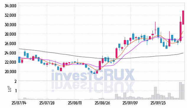 시가 : 30,000원, 고가 : 32,900원, 저가 : 29,950원