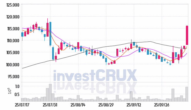 시가 : 108,100원, 고가 : 116,300원, 저가 : 108,100원