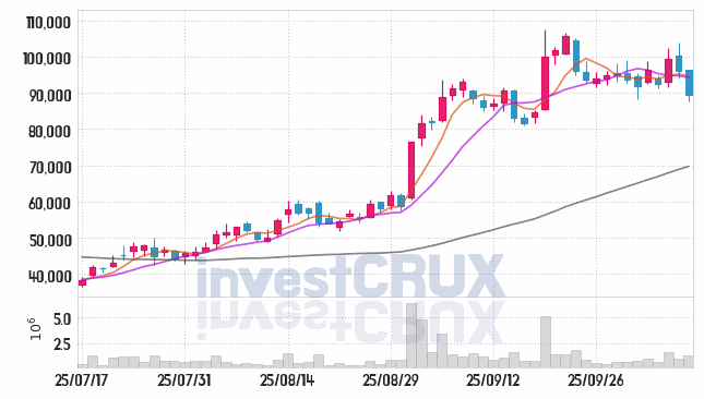 반대로, 5일간 주가 데이터 중 가장 높은 저가는 25년 10월 15일에 기록했던 94,000원인 반면 최저 저가는 25년 10월 02일에 거래되었던 88,200원입니다.