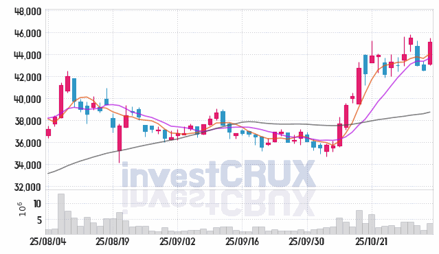 시가 : 43,100원, 고가 : 45,450원, 저가 : 43,000원