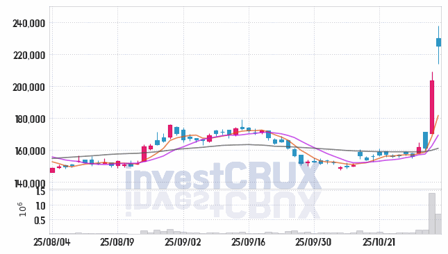 최고 거래량 기록은 25년 10월 31일에 나타난 1,417,312주이며, 최저 수치는 25년 10월 27일의 51,698주입니다.