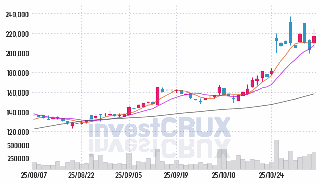 최고 거래량 기록은 25년 10월 30일에 나타난 385,974주이며, 최저 수치는 25년 10월 31일의 201,062주입니다.