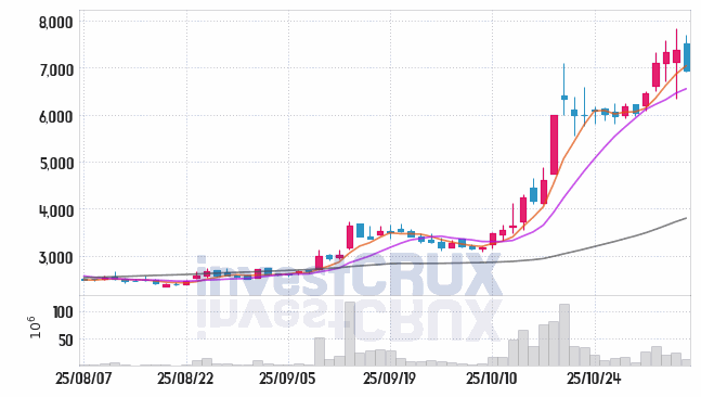 시가 : 7,500원, 고가 : 7,700원, 저가 : 6,910원