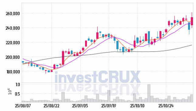 시가(243,500원)와 고가 차이는 17,500원으로 7.2% 차이가 있으며, 저가는 -4,000원 -1.6% 차이가 있는 것으로 분석되었습니다.