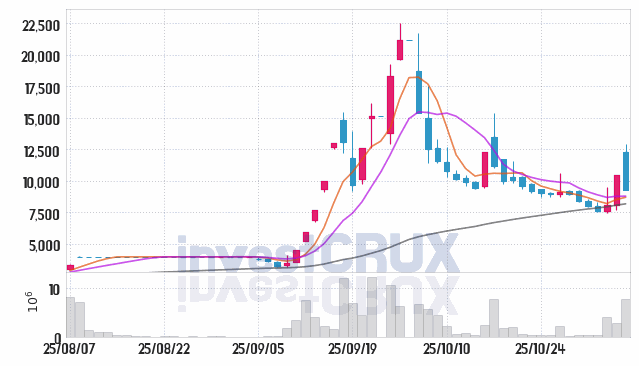 반대로, 5일간 주가 데이터 중 가장 높은 저가는 25년 10월 30일에 기록했던 8,320원인 반면 최저 저가는 25년 11월 04일에 거래되었던 7,450원입니다.