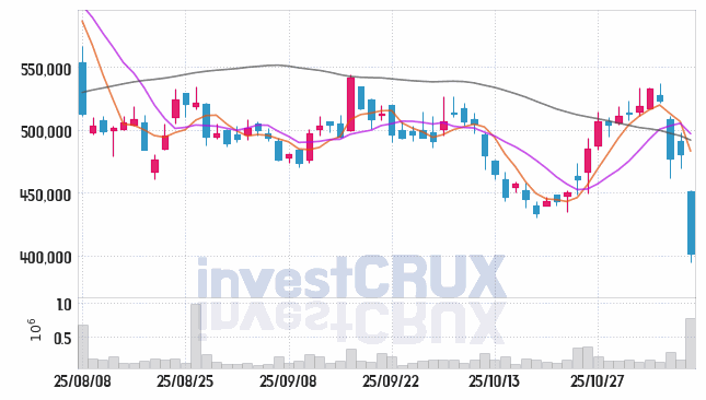 반대로, 5일간 주가 데이터 중 가장 높은 저가는 25년 11월 04일에 기록했던 522,000원인 반면 최저 저가는 25년 11월 05일에 거래되었던 462,000원입니다.