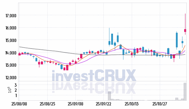 반대로, 5일간 주가 데이터 중 가장 높은 저가는 25년 11월 06일에 기록했던 14,360원인 반면 최저 저가는 25년 11월 03일에 거래되었던 13,200원입니다.