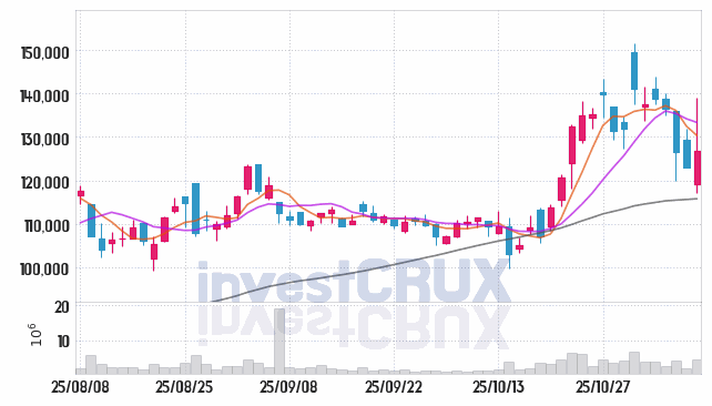 반대로, 5일간 주가 데이터 중 가장 높은 저가는 25년 11월 03일에 기록했던 137,600원인 반면 최저 저가는 25년 11월 05일에 거래되었던 120,000원입니다.