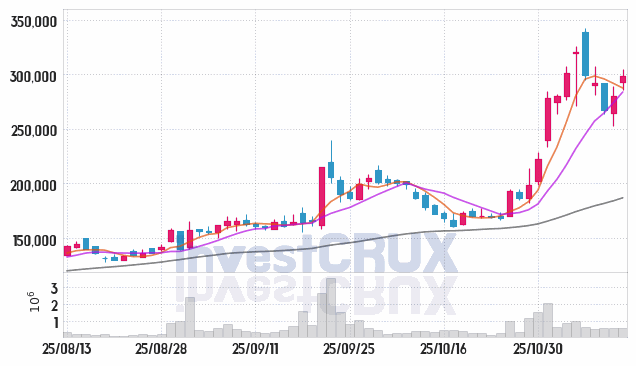 반대로, 5일간 주가 데이터 중 가장 높은 저가는 25년 11월 06일에 기록했던 295,000원인 반면 최저 저가는 25년 11월 11일에 거래되었던 253,000원입니다.