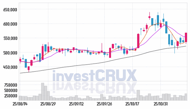 반대로, 5일간 주가 데이터 중 가장 높은 저가는 25년 11월 12일에 기록했던 534,000원인 반면 최저 저가는 25년 11월 07일에 거래되었던 496,500원입니다.
