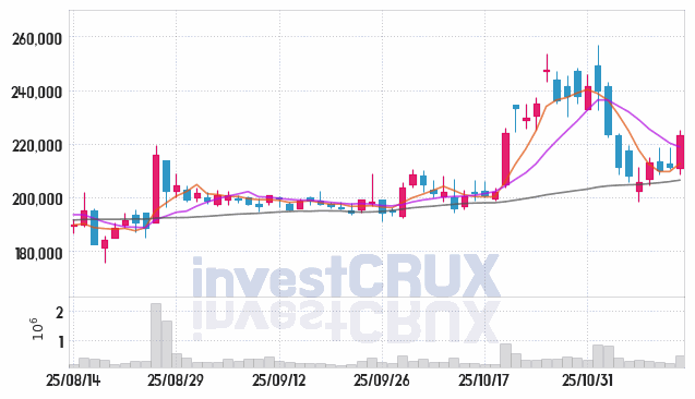 시가 : 211,000원, 고가 : 225,000원, 저가 : 208,500원