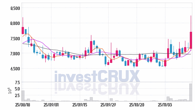 시가 : 7,150원, 고가 : 8,250원, 저가 : 7,070원