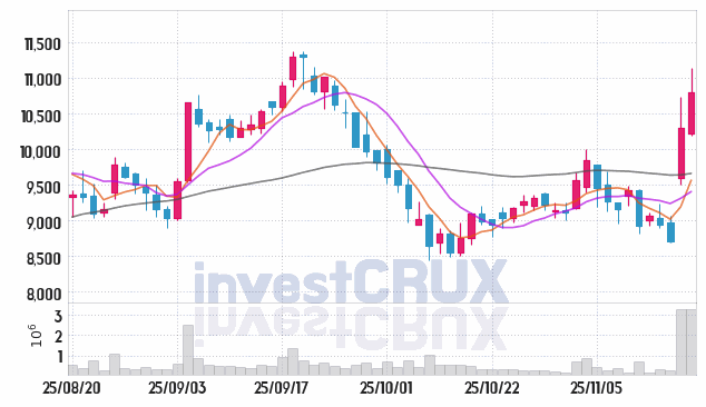 고가와 저가는 전일 종가에 비해서 각각 840원(8.2%), -110원(-1.1%) 차이가 있는 것으로 분석됩니다.
