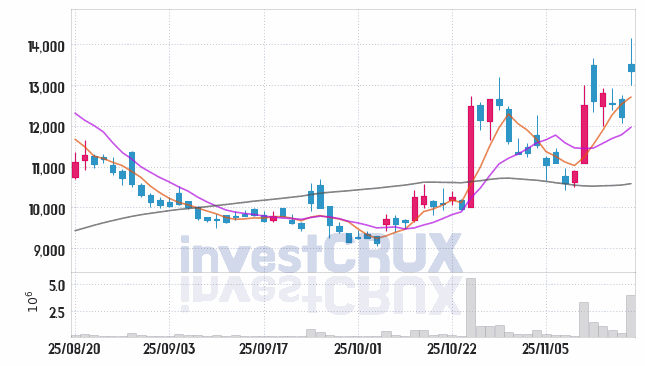 반대로, 5일간 주가 데이터 중 가장 높은 저가는 25년 11월 14일에 기록했던 12,380원인 반면 최저 저가는 25년 11월 11일에 거래되었던 11,090원입니다.