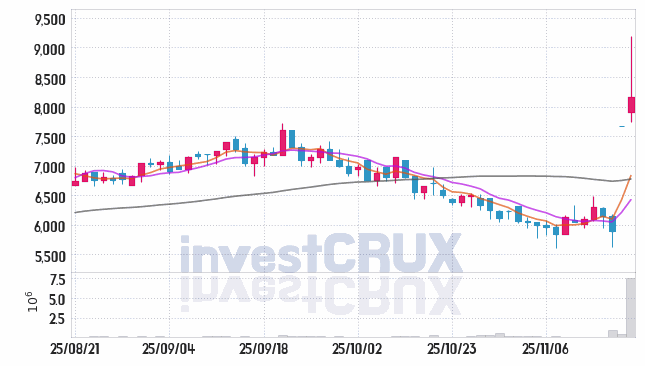 고가와 저가는 전일 종가에 비해서 각각 1,520원(19.8%), 70원(0.9%) 차이가 있는 것으로 분석됩니다.