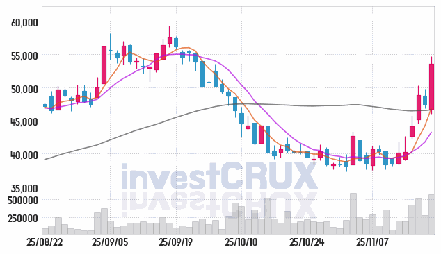 시가 : 46,800원, 고가 : 54,700원, 저가 : 46,000원