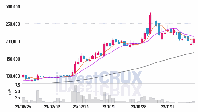 반대로, 5일간 주가 데이터 중 가장 높은 저가는 25년 11월 17일에 기록했던 201,000원인 반면 최저 저가는 25년 11월 21일에 거래되었던 188,600원입니다.