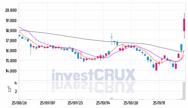 반대로, 5일간 주가 데이터 중 가장 높은 저가는 25년 11월 21일에 기록했던 15,650원인 반면 최저 저가는 25년 11월 19일에 거래되었던 14,160원입니다.