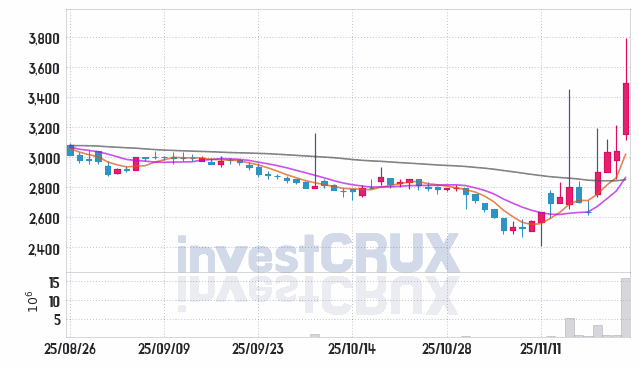 시가 : 3,150원, 고가 : 3,795원, 저가 : 3,115원