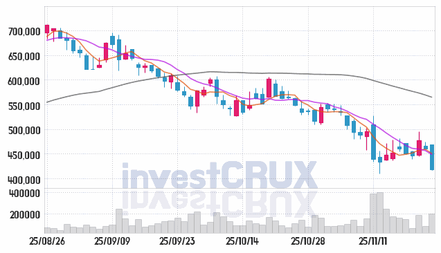 반대로, 5일간 주가 데이터 중 가장 높은 저가는 25년 11월 21일에 기록했던 458,500원인 반면 최저 저가는 25년 11월 19일에 거래되었던 440,000원입니다.