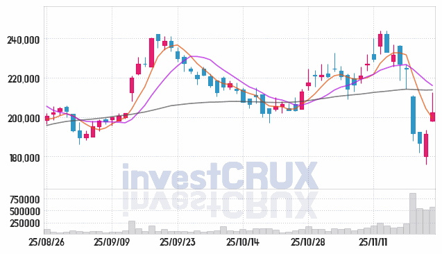 반대로, 5일간 주가 데이터 중 가장 높은 저가는 25년 11월 17일에 기록했던 218,500원인 반면 최저 저가는 25년 11월 21일에 거래되었던 176,100원입니다.