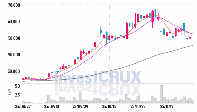 시가 : 52,200원, 고가 : 53,500원, 저가 : 51,500원