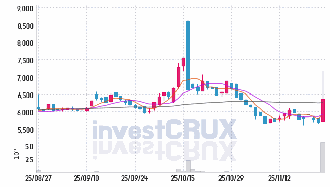 반대로, 5일간 주가 데이터 중 가장 높은 저가는 25년 11월 20일에 기록했던 5,850원인 반면 최저 저가는 25년 11월 19일에 거래되었던 5,610원입니다.