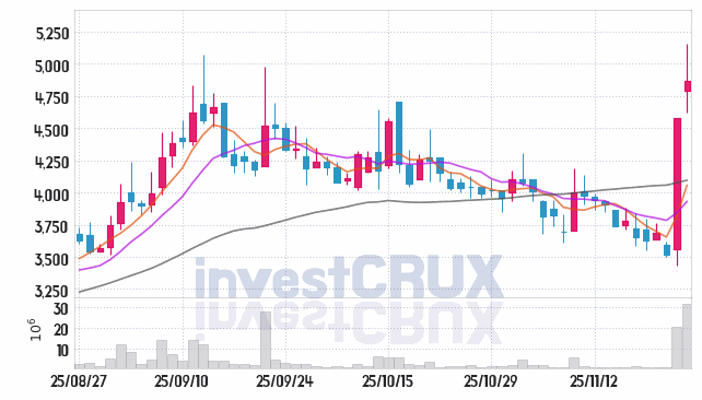 5일간 주가 데이터 중 가장 높은 고가는 25년 11월 24일의 4,575원이며, 고가 중에서도 가장 낮은 고가는 25년 11월 21일의 3,620원입니다.