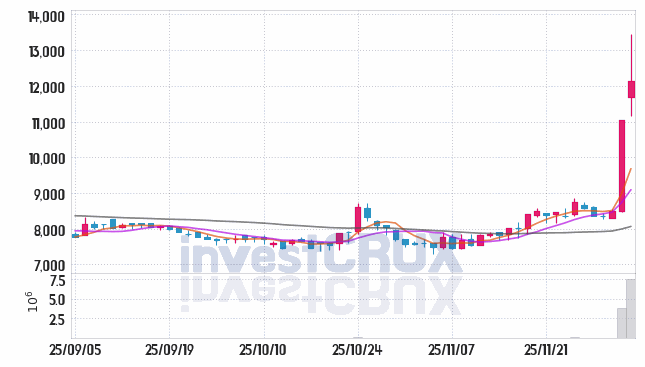 반대로, 5일간 주가 데이터 중 가장 높은 저가는 25년 11월 27일에 기록했던 8,550원인 반면 최저 저가는 25년 12월 01일에 거래되었던 8,260원입니다.
