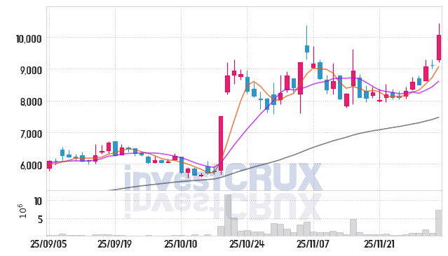 반대로, 5일간 주가 데이터 중 가장 높은 저가는 25년 12월 03일에 기록했던 9,020원인 반면 최저 저가는 25년 11월 27일에 거래되었던 8,060원입니다.