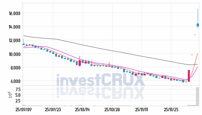 반대로, 5일간 주가 데이터 중 가장 높은 저가는 25년 12월 05일에 기록했던 12,790원인 반면 최저 저가는 25년 12월 02일에 거래되었던 5,700원입니다.