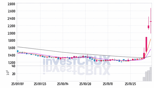 반대로, 5일간 주가 데이터 중 가장 높은 저가는 25년 12월 05일에 기록했던 2,090원인 반면 최저 저가는 25년 12월 01일에 거래되었던 1,280원입니다.