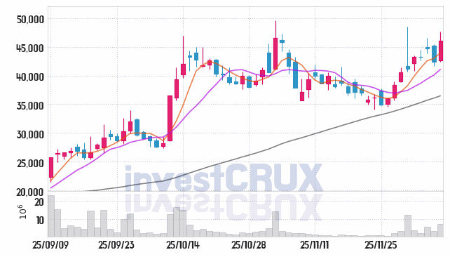 반대로, 5일간 주가 데이터 중 가장 높은 저가는 25년 12월 04일에 기록했던 43,800원인 반면 최저 저가는 25년 12월 01일에 거래되었던 40,650원입니다.
