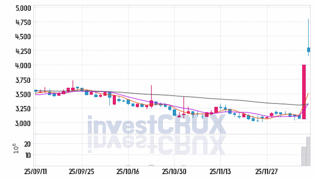 5일간 주가 데이터 중 가장 높은 고가는 25년 12월 09일의 3,995원이며, 고가 중에서도 가장 낮은 고가는 25년 12월 05일의 3,130원입니다.