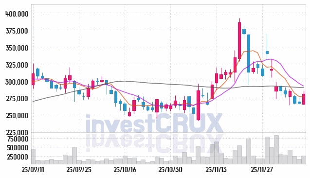 반대로, 5일간 주가 데이터 중 가장 높은 저가는 25년 12월 03일에 기록했던 277,000원인 반면 최저 저가는 25년 12월 05일에 거래되었던 264,000원입니다.