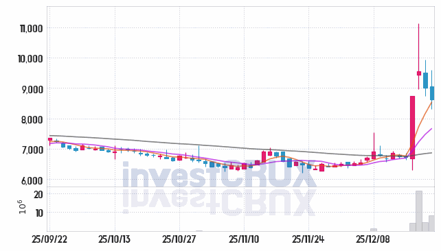 반대로, 5일간 주가 데이터 중 가장 높은 저가는 25년 12월 17일에 기록했던 8,950원인 반면 최저 저가는 25년 12월 16일에 거래되었던 6,290원입니다.