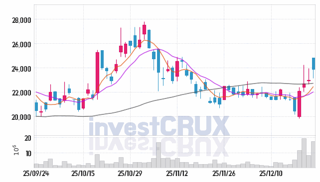반대로, 5일간 주가 데이터 중 가장 높은 저가는 25년 12월 22일에 기록했던 22,650원인 반면 최저 저가는 25년 12월 18일에 거래되었던 19,850원입니다.