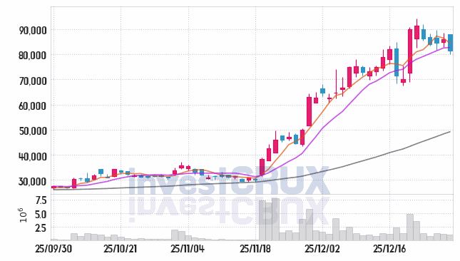 시가 : 87,900원, 고가 : 87,900원, 저가 : 80,000원
