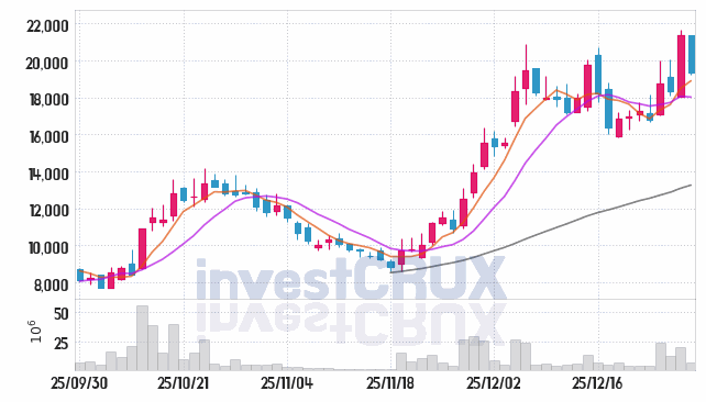 반대로, 5일간 주가 데이터 중 가장 높은 저가는 25년 12월 26일에 기록했던 18,090원인 반면 최저 저가는 25년 12월 23일에 거래되었던 16,700원입니다.