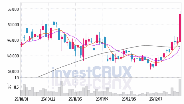 시가 : 44,350원, 고가 : 54,200원, 저가 : 44,250원