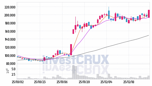 최고 거래량 기록은 25년 12월 26일에 나타난 1,693,203주이며, 최저 수치는 25년 12월 24일의 509,758주입니다.